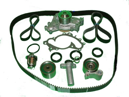 Timing Belt Kit Toyota Camry V6 1994-2001. Includes: timing belt, water pump with gasket, automatic tension adjuster, timing belt tensioner, timing belt idler, both drive belts, front cam and crankshaft seals, thermostat and gasket.